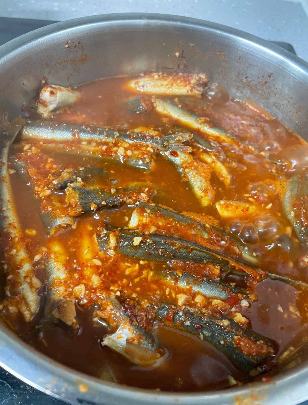 조림 국물이 끓기 시작하면 고등어를 넣고 뚜껑을 덮은 후 중약 불에서 20~30분 정도 조려줍니다. 이때 고등어가 부서지지 않도록 조심하며, 간혹 국물이 부족해질 경우 물을 추가해 가며 조리합니다.
