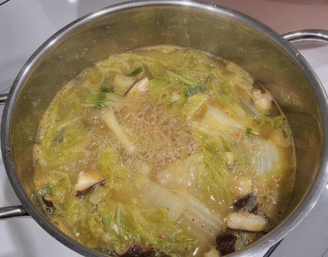 된장이 잘 풀어진 육수에 손질한 배추를 넣고 57분 정도 끓입니다. 배추가 부드러워지면 두부와 대파, 청양고추를 넣어 23분 더 끓입니다.